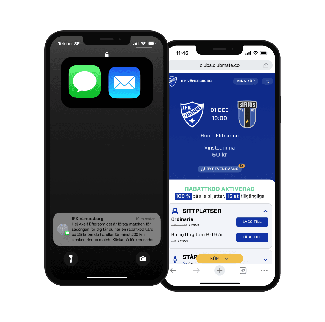 Systemet skickar automatiskt ut mejl inför och efter matchen för att påminna besökarna om att komma tillbaka. Utnyttja också att ni kan göra riktade utskick via sms/mejl till personer som inte kommit tillbaka på ett tag och med erbjudanden i kiosken.